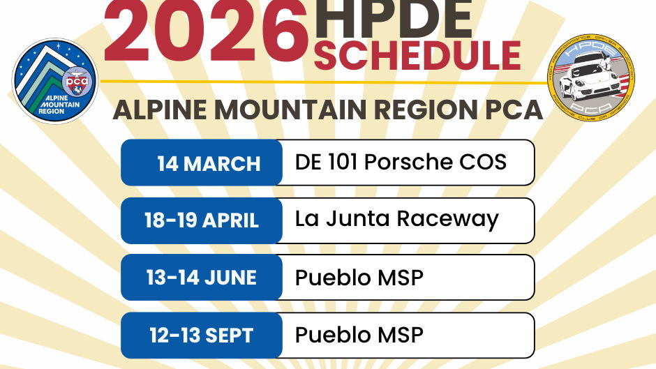 You are cordially invited to attend "DE 101" presented by the Alpine Mountain Region Porsche Club of America and generously hosted by Porsche Colorado Springs.